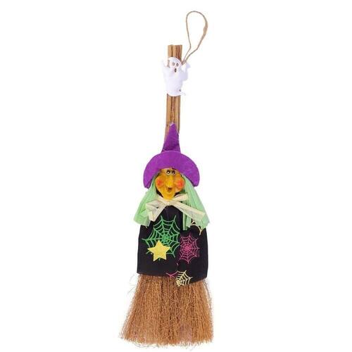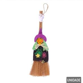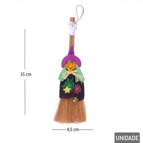 Enfeite Halloween Vassoura de Bruxa Decorada - Variedades de Halloween em escolhas entre decoração, fantasias, enfeites, utensílios e muito mais;\n- Vassoura decorativa de Bruxa com placa de Halloween;\nEspecificações:\nMarca : NYR\nTipo de material : Poliéster\nCores ou Estampa :\nDimensões do Produto : 35 X 8,5 X 4 CM\nDimensões da Embalagem : 38 X 12 X 4 CM\nPeso Bruto (Gramas) : 0.032