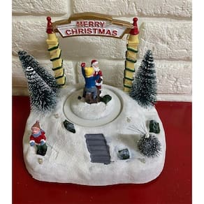 O Parque Gangorra Natalino Natal utiliza 3 pilhas AA (NÃO Inclusas) ou Cabo USB (Não acompanha adaptador de tomada)