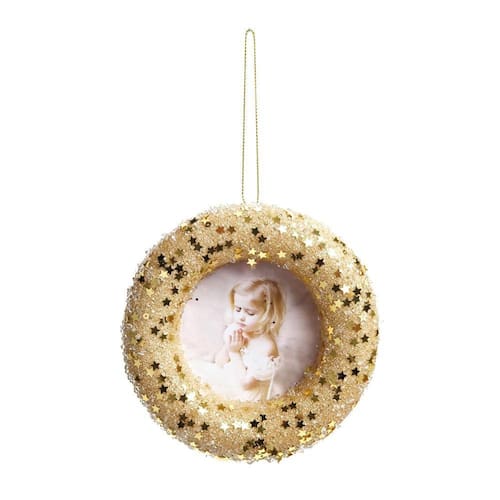 Enfeite Para Pendurar Porta Retrato Redondo, Ouro Com Glitter, 12Cm.