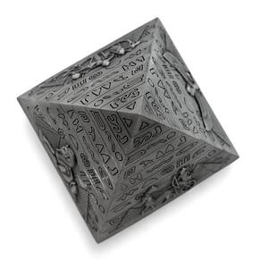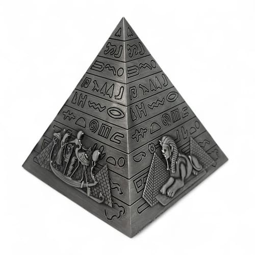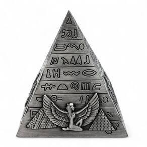 Características do Produto: Altura: 11 cm Cor: Prata metálica Design inspirado nas pirâmides do Egito Antigo com detalhes em hieróglifos egípcios Ideal para decorar estantes, mesas, escritórios, altares ou ambientes temáticos Metal Leve e resistente, fácil de posicionar em qualquer lugar