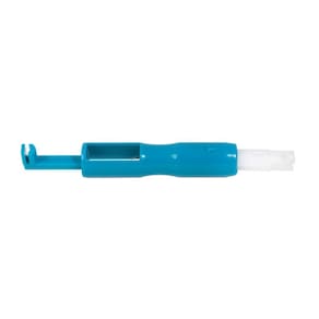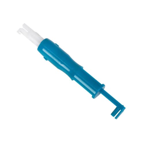 Modo de usar: Segure a alça, insira a agulha no prendedor da agulha e empurre para cima o máximo que puder. Em seguida, aperte firmemente o parafuso que prende a agulha enquanto mantém o suporte no lugar. Segure a alça do enfiador com a marca para cima. Guie a linha, inserindo-a na ranhura em Y do botão, da direita para a esquerda. Coloque a ranhura em V sobre a agulha, logo acima do buraco da agulha. Deslize o enfiador pela agulha enquanto o empurra suavemente até que o pino do enfiador entre no buraco da agulha. Empurre o punho. Remova o enfiador da agulha lentamente. Em seguida, pegue o laço com o gancho puxando a ponta da linha para trás.