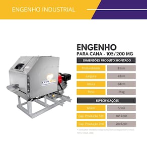 Engenho de Cana FC200 Rolo Inox com Motor Gasolina 5,5cv FC2 O modelo FC2 ECI-200-MG é ideal para locais onde não há energia elétrica disponível. Com motor a gasolina de 5,5 CV, é perfeito para feiras livres, zonas rurais e ambientes externos com alta demanda.