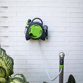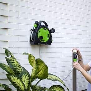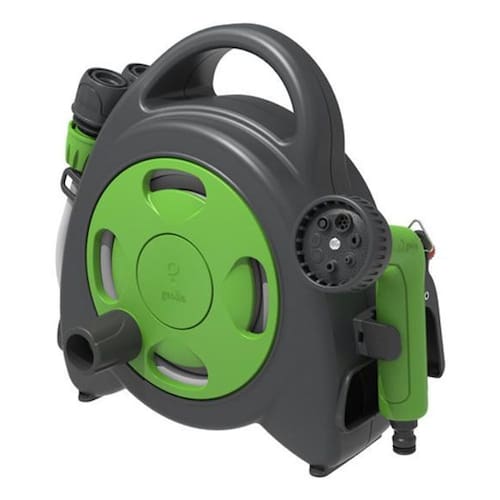 - Material: Plastico de alta resistencia - Tipo de instalacao: Parede - Sistema de enrolar: Manual - Comprimento maximo da mangueira: 115 metros - Design portatil - Facil instalacao - Inclui suporte de parede para fixacao - Ideal para jardins de tamanho medio a grande - Resistente as intemperies