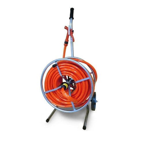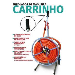 Enrolador Tipo Carrinho De Mangueira Em Metal Características: Luva emborrachada no cabo Capacidade de 40 m de mangueira Tubo de aço galvanizado Rodinhas para transporte Cabo com regulagem de altura Engate rápido giratório Ean: 7893897714197