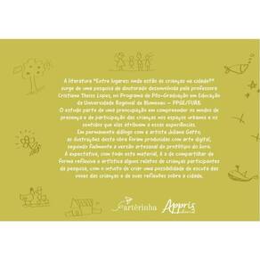 A literatura “Entre lugares: onde estão as crianças na cidade?” surge de uma pesquisa de doutorado desenvolvida pela professora Cristiane Theiss Lopes, no Programa de Pós-Graduação em Educação da Universidade Regional de Blumenau – PPGE/FURB. O estudo parte de uma preocupação em compreender os modos de presença e de participação das crianças nos espaços urbanos e os sentidos que elas atribuem a essas experiências. Em permanente diálogo com a artista Juliana Gatto, as ilustrações desta obra foram produzidas com arte digital, seguindo fielmente a versão artesanal do protótipo do livro. A expectativa, com todo este material, é a de compartilhar de forma reflexiva e artística alguns relatos de crianças participantes da pesquisa, com o intuito de criar uma possibilidade de escuta das vozes das crianças e de suas reflexões sobre a cidade. Marca: ARTERINHA EDITORA