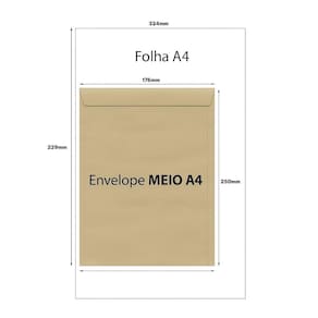 Tamanho: 176mm x 250mm ideal para documentos Meio A4 Quantidade: 125 unidades Cor: Pardo Tipo de Fechamento: Liso, sem janelas Uso: Perfeito para envio de documentos, cartas e outros papéis Gramatura: Alta resistência e durabilidade