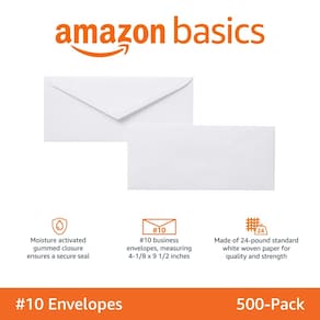 Envelopes de carta comercial Amazon Basics #10 com selo gomado, pacote com 500, sem tinta