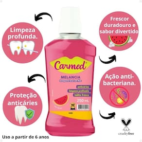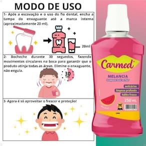 O Enxaguante Bucal Carmed Melancia oferece uma sensação de frescor prolongado, combinando a eficácia da proteção bucal com o sabor agradável de melancia. Formulado para complementar a escovação, este enxaguante auxilia na prevenção de cáries, combate a placa bacteriana e proporciona um hálito fresco e agradável por muito mais tempo. Sua fórmula suave é ideal para o uso diário, promovendo saúde bucal sem causar irritações. A embalagem de 250ml é prática, perfeita para o uso em casa ou para levar na bolsa. Com o Enxaguante Bucal Carmed Melancia, você mantém sua boca limpa, protegida e com um gosto delicioso de melancia.