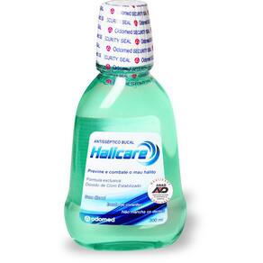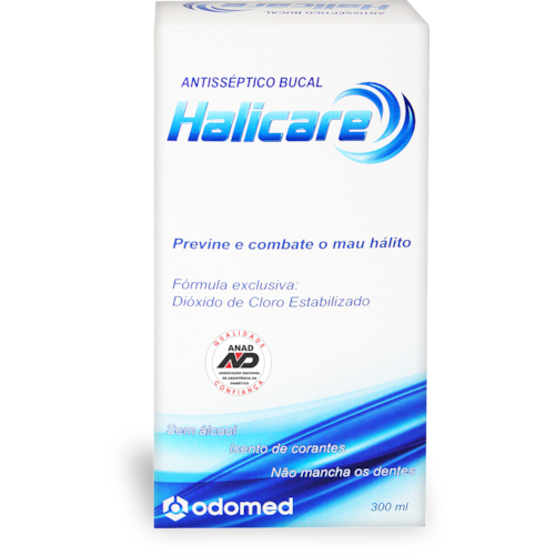 Enxaguante Bucal Halicare 300ml.O Enxaguante Halicare foi desenvolvido especialmente para prevenir combater a halitose, protegendo sua boca da ação das bactérias que causam o mau hálito, através de sua fórmula exclusiva a base de dióxido de cloro. Como não possui contra indicação de uso, é um eficiente complemento diário na higienização bucal. Graças a sua ação protetora contra bactérias tem se mostrado um agente importante em: Amigdalites, cáseos amigdalíticos, mucosites, lesões causadas por ressecamento bucal, assepsia em procedimentos pré e pós clínicos e cirúrgicos na cavidade bucal.O Enxaguante Halicare possui tampa dosadora. Coloque de 5 a 10 ml na boca e faça vários gargarejos. Fazer gargarejos é muito importante para o processo de limpeza da língua e da garganta. O gargarejo e/ou bochecho deve ser realizado durante um minuto. Ao final do procedimento cuspa o produto. Após realizar o procedimento, recomenda-se que fique durante 30 minutos sem comer ou beber. Portanto, o Enxaguante Halicare deve ser o último procedimento de sua higienização bucal. Ele protege sua boca em média por oito horas.A higienização bucal deve ser realizada na seguinte ordem: fio dental, escovação, limpeza da língua e Enxaguante Halicare. Use o Enxaguante Halicare ao menos três vezes ao dia - depois do café da manhã, após o almoço e antes de dormir.