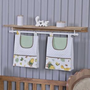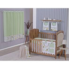 Contém na embalagem: 1 lençol com elástico 1,30m comp x 0,70m larg x 0,15m alt 1 lençol sem elástico 1,35m comp x 1,05m larg 1 fronha 40cm comp x 30cm larg 1 manta dupla face 1,15m comp x 0,95m larg manta de microfibra na cor bege de um lado e tecido de algodão do outro 2 porta fraldas 43cm alt x 32cm larg x 10cm prof para ser pendurado em varão em móveis ou na parede 1 porta treco 64cm larg x 54cm alt para ser pendurado em varão ou no berço 1 cortina 2,70m larg x 1,60 alt 2 partes de 1,35m larg