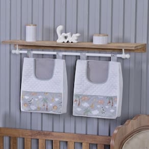 Contém na embalagem: 1 lençol com elástico 1,30m comp x 0,70m larg x 0,15m alt 1 lençol sem elástico 1,35m comp x 1,05m larg 1 fronha 40cm comp x 30cm larg 1 manta dupla face 1,15m comp x 0,95m larg manta de microfibra na cor bege de um lado e tecido de algodão do outro 2 porta fraldas 43cm alt x 32cm larg x 10cm prof para ser pendurado em varão em móveis ou na parede 2 porta fraldas com laço 38cm alt x 32cm larg x 10cm prof para ser pendurado em varão ou no berço 1 cortina 2,70m larg x 1,60 alt 2 partes de 1,35m larg