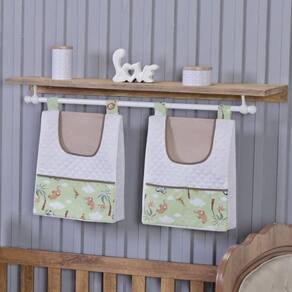 Contém na embalagem: 1 lençol com elástico 1,30m comp x 0,70m larg x 0,15m alt 1 lençol sem elástico 1,35m comp x 1,05m larg 1 fronha 40cm comp x 30cm larg 1 manta dupla face 1,15m comp x 0,95m larg manta de microfibra na cor bege de um lado e tecido de algodão do outro 2 porta fraldas 43cm alt x 32cm larg x 10cm prof para ser pendurado em varão em móveis ou na parede 1 cortina 2,70m larg x 1,60 alt 2 partes de 1,35m larg