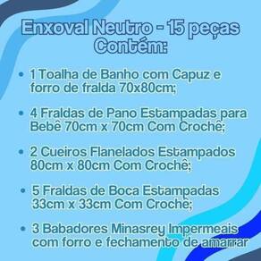 Especificações do Kit MASCULINO: Total de Produtos: 15 Peças Contém 1 Toalha de Banho com Capuz e forro de fralda 70x80cm Contém 4 Fraldas de Pano Estampadas para Bebê 70cm x 70cm Com Crochê Contém 2 Cueiros Flanelados Estampados para Bebês 80cm x 80cm Com Crochê Contém 5 Fraldas de Boca Estampadas para Bebê 33cm x 33cm Com Crochê Contém 3 Babadores Minasrey Impermeais com forro e fechamento de amarrar
