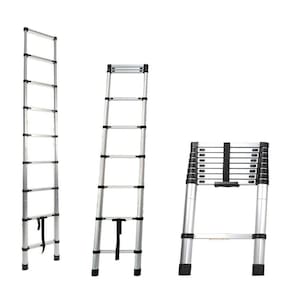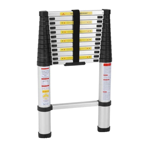 Escada telescópica extensível com 10 degraus. Em alumínio com pés antiderrapantes. Possui travas de segurança para elevação de cada degrau.