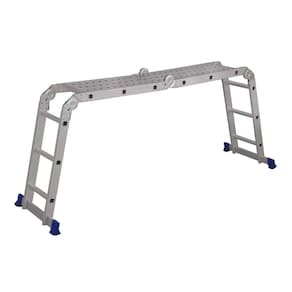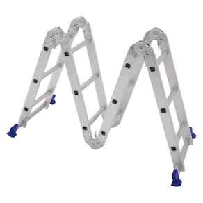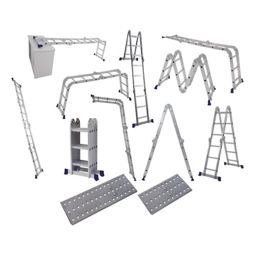 Escada multifuncional com estrutura em alumínio e chapas de aço para uso como plataforma. Possui 4 partes com 3 degraus cada, totalizando 12 degraus com ranhuras antiderrapantes. Conta com travamento automático na extensão e ponteiras emborrachadas abauladas. Suporta até 150 kg. Quando totalmente estendida, alcança a altura de 3,37 m. O produto é dobrável, facilitando o transporte e o armazenamento.