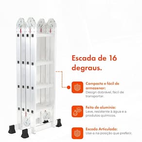 Escada Articulada de Alumínio: Versatilidade e Alcance para suas Tarefas A Escada Articulada de Alumínio com 16 degraus proporciona um alcance de até 4,24 metros, tornando-a a escolha ideal para alcançar locais elevados com facilidade e segurança. É ajustável em várias posições graças ao seu sistema de articulação em 4 partes, cada uma com 4 degraus. Equipada com sistema de trava em cada seção e sapatas antiderrapantes, esta escada oferece estabilidade e segurança em cada degrau. -Especificações Altura posição fechada : 1,18 m Altura máxima posição estendida : 4,24 m Altura máxima posição pintor : 2,20 m Altura máxima de uso posição pintor : 2,07 m Indicação do ângulo de inclinação: entre 70° e 78° Altura posição andaime : 1,24 m Largura: 34,00 cm Quantidade de degraus: 16 Número de posições de ajuste: 4 Capacidade de carga: 150 kg incluindo operador + ferramentas Massa aproximada: 9.2 kg. Marca: Não Informado