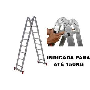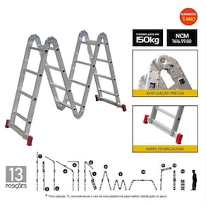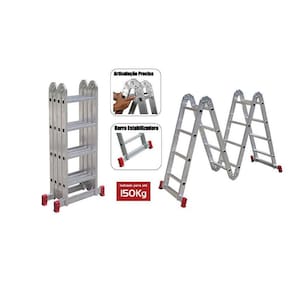 Escada Articulada 4x4 Degraus em Alumínio BTF ESC0293 Escada Multifunção Articulada 4x4 degraus 4 sessões de 4 degraus , em alumínio, leve e fácil de transportar, pode ser utilizada estendida, como andaime, na posição de pintor e em outras 10 posições. Articulações precisas com travamento automático, barras estabilizadoras para melhor fixação e degraus antiderrapantes com maior área de contato. Altura Andaime: 1,11 m; Altura Pintor: 1,91 m; Altura Estendida: 4,23 m; Medidas Fechada: 62,8 X 28,5 X 114 cm - L x C x H; Peso: 12,42 Kg; Peso Suportado: 150 Kg Carga Total ; Marca: Botafogo Lar & Lazer; : 12 meses; Marca: Não Informado