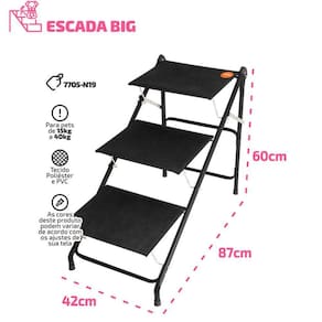 A Escada Big suporta um peso máximo de até 40kg, sendo indicada tanto para cães quanto para gatos. Além disso, sua cor predominante é preta, o que a torna uma opção versátil e elegante para a decoração do ambiente.