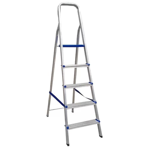 ESCADA ALUMINIO DOMESTICA 05 DEGRAUS REALEscada em alumínio de liga especialSuper resistenteDegraus e sapatas antiderrapantesTrava de segurança em alumínio com articulação lateralSistema de sustentação traseira em XSuporta até 120KgPossui 5 degrausAltura: Aberta: 156cm Fechada: 169cm Patamar: 110cmGarantia: 12 meses ..