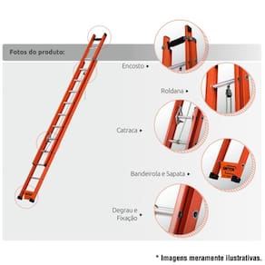 Escada composta de lance fixo e lance móvel acionado por corda, degraus no formato D em liga de alumínio prensado diretamente nos perfis de fibra de vidro.
