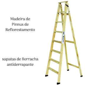 Escada de Madeira Americana com Sapata 12 Degraus - MADEIRA 12DEGR - ESCADAS SEGURANÇA Características:- Nossas escadas são fortes e robustas produzidas de forma a garantir a segurança de quem as utiliza.- Próprias para uso domésticos apta para serviços diversos aonde for necessária.- Toda a madeira é aparelhada e lixada proporcionando um excelente acabamento e qualidade.- Cada degrau suporta até 110 kg de peso total.- Todas as ferragens são galvanizadas, as dobradiças correntes, parafusos e travas de segurança são testadas e aprovadas e de grande durabilidade.- São leves e de fácil manuseio, ideal para as mais diversas utilizações, pinturas, manutenção, eletricidade, limpeza, etc.- Por ser de madeira não conduz eletricidade e por isso ideal para trabalhos com eletricidade.- Fabricadas com madeira de reflorestamento certificada de origem legal são ecologicamente Corretas. Especificações:- Tipo: Escada Americana- Acessórios: Sapata de Borracha, Trava anti abertura, corrente de segurança.- Material: Madeira Pinnus de reflorestamento- Ferragens: Galvanizadas- Montagem: Degraus encaixados, colados e parafusados.- Capacidade: 110 kg- Uso: Chão- Garantia: 90 dias pelo fabricante (defeitos de fabricação)