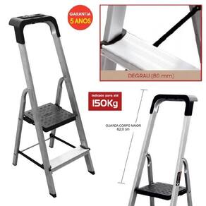Escada Doméstica 5 Degraus em Alumínio Botafogo PRO ESC0025 Para quem procura uma escada doméstica com maior capacidade de carga e medidas maiores, apresentamos a Botafogo Pro. desenvolvida com padrão europeu, é comercializada tanto no mercado interno como no externo. Ela é sinônimo de qualidade. Proporciona maior alcance, conforto e segurança. Alcance, pois seu entre degraus é maior, tornando-a mais alta. Conforto, pois os seus degraus e patamar são maiores que os das escadas convencionais. Mais segurança, pois sua estrutura reforçada faz com que ela suporte até 150kg. Além de possuir um guarda corpo bem maior. Agora, o que é ainda mais bacana nela é o seu suporte de utilidades. Nele podemos apoiar diversas ferramentas, lâmpada e tem até um gancho para pendurar balde. É um produto certificado pelo INMETRO, 100% nacional e sustentável. Já que em seu fim de ciclo pode ser totalmente reciclável. Está disponível de 2 à 7 degraus. E ainda possui incríveis 5 anos de garantia contra defeitos de fabricação. Então não esqueça. Escada doméstica, mas com pegada Profissional, é a Botafogo PRO