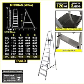A Escada Doméstica de Alumínio 9 Degraus EVE1029 EVALD é a escolha perfeita para quem busca unir segurança, praticidade e um design moderno em um único produto. Desenvolvida em alumínio de alta qualidade, esta escada alia robustez e leveza, permitindo um manuseio ágil e o transporte facilitado tanto em ambientes internos quanto externos. Seu design inovador foi pensado para maximizar a economia de espaço, já que, quando fechada, ocupa uma área mínima, ideal para residências e pequenos estabelecimentos onde a organização é essencial, cada detalhe deste modelo foi cuidadosamente planejado para proporcionar a máxima estabilidade e conforto durante o uso. Com 9 degraus amplos e bem distribuídos, a escada oferece uma base segura para a realização de diversas atividades, desde reparos e manutenção até tarefas de limpeza e organização. As sapatas antiderrapantes garantem excelente aderência em diferentes tipos de piso, reduzindo significativamente os riscos de escorregamentos. Além disso, o patamar confeccionado em polipropileno reforçado conta com um sistema de trava que impede movimentos indesejados, assegurando que cada etapa das atividades seja executada com total confiança. Com capacidade para suportar até 120 kg, o produto é versátil e adequado para variadas demandas do dia a dia, comprometida com a sustentabilidade, a Escada Doméstica de Alumínio 9 Degraus EVE1029 EVALD utiliza alumínio 100% reciclável, reafirmando seu compromisso com o meio ambiente. Certificada pelo INMETRO e acompanhada de uma garantia de 3 anos. Investir na EVE1029 é optar por um produto inovador, seguro e sustentável, que transforma as tarefas cotidianas em experiências mais eficientes e descomplicadas.