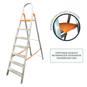 Escada Doméstica de Alumínio com Acessórios em Polipropileno 8 Degraus Antiderrapantes - EDS008 - AGATA Descrição: Escada Doméstica de Alumínio com 8 Degraus Características: - Patamar e acessórios em polipropileno - Fita de segurança - Sapatas antiderrapantes - Carga máxima de até 120 Kg Instruções de Uso: - Atenção: Este produto é para uso exclusivamente não continuado, geralmente ligado à atividade doméstica - Atenção: Este produto não foi projetado para uso continuado, geralmente ligado à atividade semi-profissional, profissional ou industrial - Guarde este manual de instruções para eventual consulta - Antes de utilizar a escada, verifique as condições do produto - Observe o peso máximo suportado pela escada - Não use em piso escorregadio ou irregular - Não utilize a escada por duas pessoas simultaneamente - Não utilize a escada próximo a redes elétricas - Não utilize a escada com calçados deslizantes - Descarte a escada se trincada, quebrada, desgastada, avariada, exposta ao fogo ou à corrosão química Registro de Certificação do Inmetro: 003692/2023 *Imagens meramente ilustrativas.