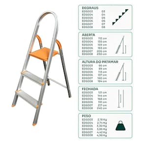 Escada Doméstica de Alumínio com Acessórios em Polipropileno com 4 Degraus Antiderrapantes - EDS004 - AGATA Descrição: Escada Doméstica de Alumínio com Acessórios em Polipropileno com 4 Degraus Antiderrapantes. Características: - Patamar e acessórios em polipropileno - Fita de segurança - Sapatas antiderrapantes - Carga máxima de até 120 Kg Instruções de Uso: - Atenção: Este produto é para uso exclusivamente não continuado, geralmente ligado à atividade doméstica - Atenção: Este produto não foi projetado para uso continuado, geralmente ligado à atividade semi-profissional, profissional ou industrial - Guarde este manual de instruções para eventual consulta - Antes de utilizar a escada, verifique as condições do produto - Observe o peso máximo suportado pela escada - Não use em piso escorregadio ou irregular - Não utilize a escada por duas pessoas simultaneamente - Não utilize a escada próximo a redes elétricas - Não utilize a escada com calçados deslizantes - Descarte a escada se trincada, quebrada, desgastada, avariada, exposta ao fogo ou à corrosão química Registro de Certificação do Inmetro: 003692/2023 *Imagens meramente ilustrativas.