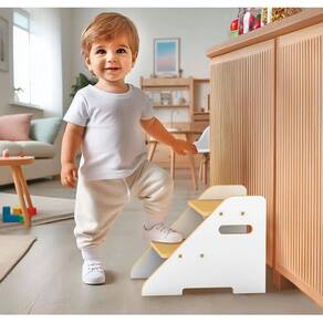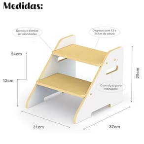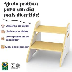 Escada infantil montessoriana com 2 degraus, cantos arredondados e pegador anatômico. Incentiva a independência e autonomia da criança. Feita de madeira de reflorestamento com pintura atóxica. Certificada pelo Inmetro. Suporta até 35 kg.Tipo