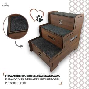 Escada para Cachorro 3 degraus escadinha para cachorro Pet Escada desenvolvida e pensada para seu PET ter mais conforto e acessibilidade em locais de dificil acesso. Produzida com material de alta qualidade e resistencia, suportando tambem animais de grande porte. Diferenciais do Nosso Produto Degraus em mdf 6mm, suportando até 8kg Escada montada com encaixes e parafusos Tapete antiderrapante Evita lesões e acidentes com seus pets ESPECIFICAÇÕES DO PRODUTO - Altura: 46 cm - Largura: 40 cm - Profundidade: 50 cm - Altura dos Degraus: 15 cm - Largura dos Degraus: 17 cm - Número de Degraus: 03 - Estrutura Degraus: MDF 6 mm - Revestimento: Melamina - Acompanha kit para de instalação. INSTALAÇÃO A instalação é bem simples, basta acompanhar o passo a passo do manual LIMPEZA / MANUTENÇÃO Para limpeza, utilize apenas um pano umedecido com água sem produtos químicos para garantir a durabilidade. TOTAL: Todos nossos produtos contam com contra defeitos de fabricação.
