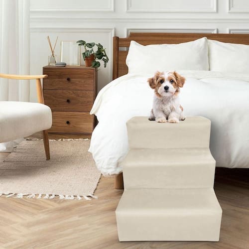 Dê mais autonomia, conforto e segurança para seu pet subir na cama ou no sofá com essa linda Escada Pet de 3 Degraus revestida em veludo!