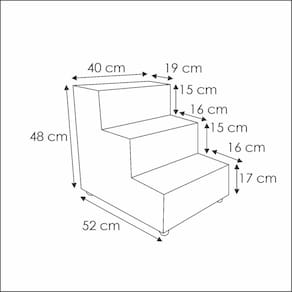 Escada Para Cachorro Estofada 3 Degraus - KF Móveis A Escada para Cachorro Estofada 3 Degraus da KF Móveis é perfeita para auxiliar nossos amiguinhos de quatro patas a subir e descer de lugares como sofás, poltronas, camas e muito mais. Com ela, você evita o impacto nas articulações do seu pet, contribuindo para o seu bem-estar. Com um design estofado e elegante, essa escada pet é ideal para animais com peso de até 30 quilos. Ela possui 3 degraus estofados com altura de 16 cm e profundidade de 16 cm, proporcionando conforto e segurança para o seu pet. A estrutura da escada é feita em madeira de reflorestamento, garantindo resistência e durabilidade. Os degraus e laterais são preenchidos com espuma D23, oferecendo maciez e conforto para o seu pet. Além disso, a escada possui sapatas que evitam que ela escorregue, garantindo maior estabilidade. O revestimento em tecido linha A confere um toque de sofisticação ao produto. A escada é enviada montada, facilitando o seu uso imediato. Ela possui as seguintes medidas: altura de 48 cm, largura de 40 cm e profundidade de 52 cm. Para limpar a escada, basta utilizar um pano levemente úmido. Recomendamos evitar o uso de produtos químicos agressivos, para preservar a qualidade do tecido e da estrutura. A Escada para Cachorro Estofada 3 Degraus - KF Móveis é uma ótima opção para garantir o conforto e bem-estar do seu pet. Aproveite e adquira já a sua! Informações técnicas: - Marca: KF Móveis - Material da estrutura: Madeira de reflorestamento - Revestimento: Tecido linha A - Espuma: D23 - Altura dos degraus: 16 cm - Profundidade dos degraus: 16 cm - Peso suportado: até 30 kg - Medidas: altura 48 cm, largura 40 cm, profundidade 52 cm - Sapatas: Sim - do fabricante: 90 dias contra defeitos de fabricação Observações: - Pode haver diferença de tonalidade entre a imagem e o produto real devido ao tratamento de imagens e calibração de cores do seu monitor ou celular. - As imagens são meramente ilustrativas e não acompanham objetos de decoração e eletrônicos.