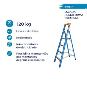 As escadas plataforma premium são de acesso unilateral, sendo compostas por duas partes: a frontal é acessível a utilização e a traseira serve unicamente para apoio. Os degraus são fixados aos montantes por rebites, o que possibilita sua troca. Estas escadas possuem uma plataforma de 270 x 300 cm em alumínio e um patamar fixado na parte superior dos montantes para o acabamento da escada e apoio de acessórios.