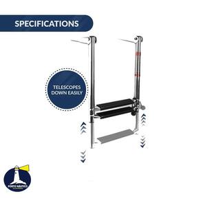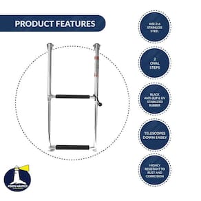 Esta escada telescópica para barco sobre plataforma marítima, 2 etapas para uso no convés e montagem na plataforma. Ideal para um acesso seguro de e para a água. Fabricado em aço inox aisi316 com alta resistência à ferrugem e corrosão, mesmo quando exposto à água do mar. Os degraus são cobertos com material de borracha preta anti-derrapante e estabilizada aos raios uv. Degraus ovais, proporcionam um ambiente mais suave e confortável do que degraus arredondados tradicionais.