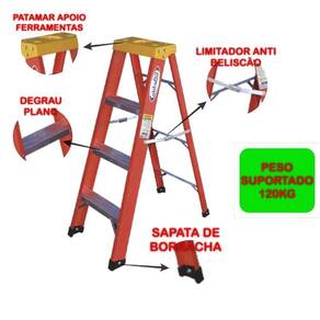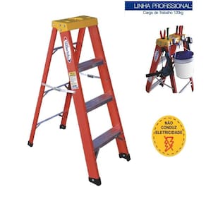 Escada Tesoura 1.2m Alumínio/Fibra 4 degraus WBertolo TAF 4 Escadas profissionais de alta performance Por não serem condutoras de energia, são ideais para trabalhos que envolvam eletricidade. De fácil manuseio, suportam carga máxima em todos os modelos de 120 kg/136 kg, com exceção da banqueta - 150 kg, e contribuem também para a segurança em atividades de telecomunicação, manutenção, pintura, trabalho em altura, instalações, dentre outras. Todas são de uso em baixa e média tensão com alto padrão de qualidade da marca que você já conhece. - Especificações Técnicas: Modelo: Profissional TAF 4 Peso: 4,50 Kg Material: Alumínio E Fibra Altura: 1,20 Metros Número De Degraus: 3 Degraus + 1 Patamar Carga Máxima De Trabalho: 120Kg As escadas Tesoura TAF são escadas em formato A, compostas por duas partes. A parte frontal possui os degraus de alumínio planos com frisos antiderrapantes. A parte traseira que serve apenas de apoio, onde não há acesso para a utilização. Essas escadas são leves, com baixa absorção de água e não condutoras de eletricidade. Ideais para uso industrial, comercial e doméstico. Fabricação São fabricadas em Perfil U em fibra de vidro por processo de pultrusão e degraus planos em alumínio com frisos antiderrapantes, proporcionando maior conforto e segurança em sua utilização. São fabricadas conforme a norma ABNT/NBR 16308. Padronização: Sapatas de borracha patamar para apoio de ferramentas limitador de abertura antibeliscão etiquetas para sua identificação. Composição Alumínio Fibra de Vidro Borracha Polipropileno Informação Carga máxima de trabalho de 120 kg Leves e duráveis Resistentes Não condutora de eletricidade Essas escadas permitem 100% de manutenção O patamar da escada não é considerado um degrau útil.