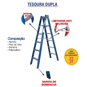 As escadas Tesouras Duplas (TAFD) são escadas compostas por duas partes e podem ser utilizadas de ambos os lados. Estas escadas são leves, com baixa absorção de água e não são condutoras de eletricidade. Fabricadas conforme a norma ABNT/NBR 16308.