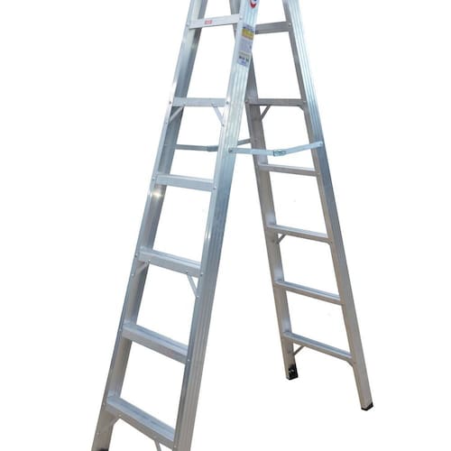 A Escada tesoura dupla Premium possui o formato “A”, são compostas por duas partes que podem ser utilizadas de ambos os lados (sempre respeitando uma pessoa por vez). É resiste e conduz eletricidade, conta com acessórios sapata de polipropileno e limitador de abertura (anti beliscão).
