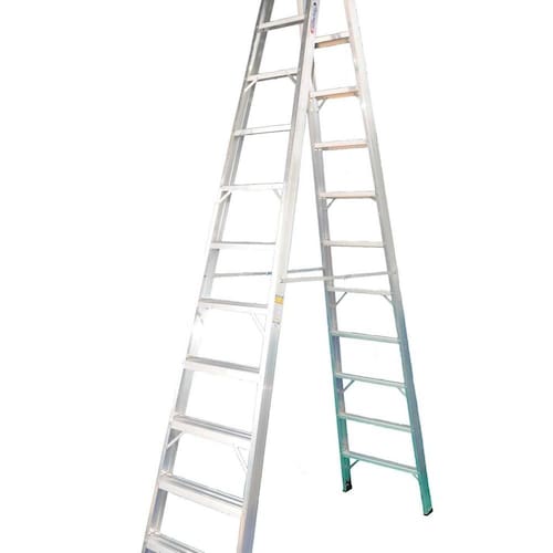 A Escada tesoura dupla possui o formato “A”, são compostas por duas partes que podem ser utilizadas de ambos os lados (sempre respeitando uma pessoa por vez). É resiste e conduz eletricidade, conta com acessórios sapata de polipropileno e limitador de abertura (anti beliscão).