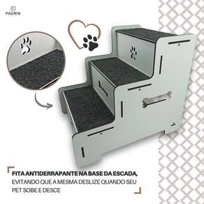 Escadinha para Cachorro Escada para Cachorro 3 degraus Pet Escada desenvolvida e pensada para seu PET ter mais conforto e acessibilidade em locais de dificil acesso. Produzida com material de alta qualidade e resistencia, suportando tambem animais de grande porte. Diferenciais do Nosso Produto Degraus em mdf 6mm, suportando até 8kg Escada montada com encaixes e parafusos Tapete antiderrapante Evita lesões e acidentes com seus pets ESPECIFICAÇÕES DO PRODUTO - Altura: 46 cm - Largura: 40 cm - Profundidade: 50 cm - Altura dos Degraus: 15 cm - Largura dos Degraus: 17 cm - Número de Degraus: 03 - Estrutura Degraus: MDF 6 mm - Revestimento: Melamina - Acompanha kit para de instalação. INSTALAÇÃO A instalação é bem simples, basta acompanhar o passo a passo do manual LIMPEZA / MANUTENÇÃO Para limpeza, utilize apenas um pano umedecido com água sem produtos químicos para garantir a durabilidade. TOTAL: Todos nossos produtos contam com contra defeitos de fabricação.