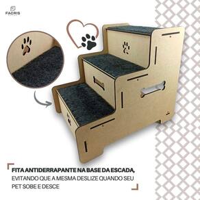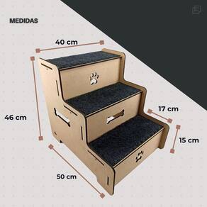 Escadinha para Cachorro Pet Escada para Cachorro 3 degraus Escada desenvolvida e pensada para seu PET ter mais conforto e acessibilidade em locais de dificil acesso. Produzida com material de alta qualidade e resistencia, suportando tambem animais de grande porte. Diferenciais do Nosso Produto Degraus em mdf 6mm, suportando até 8kg Escada montada com encaixes e parafusos Tapete antiderrapante Evita lesões e acidentes com seus pets ESPECIFICAÇÕES DO PRODUTO - Altura: 46 cm - Largura: 40 cm - Profundidade: 50 cm - Altura dos Degraus: 15 cm - Largura dos Degraus: 17 cm - Número de Degraus: 03 - Estrutura Degraus: MDF 6 mm - Revestimento: Melamina - Acompanha kit para de instalação. INSTALAÇÃO A instalação é bem simples, basta acompanhar o passo a passo do manual LIMPEZA / MANUTENÇÃO Para limpeza, utilize apenas um pano umedecido com água sem produtos químicos para garantir a durabilidade. TOTAL: Todos nossos produtos contam com contra defeitos de fabricação. Marca: Não Informado