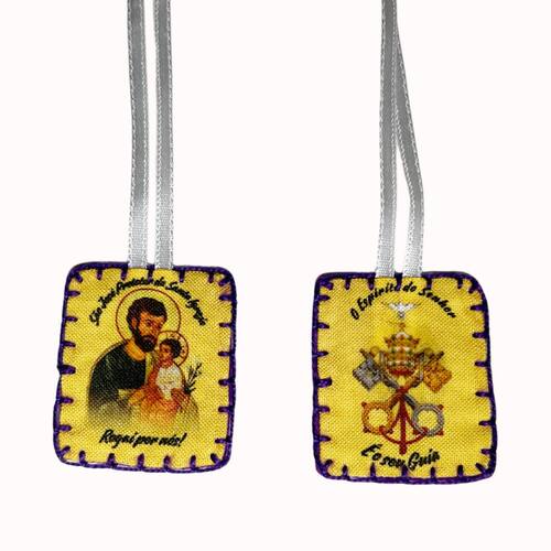 A peça possui de um lado, a imagem de São José com o Menino Jesus e do outro, o símbolo do Vaticano com a frase "O Espírito do Senhor é o seu guia". A fita do escapulário é branco e as medalhas são roxas atrás e amarelas na frente.