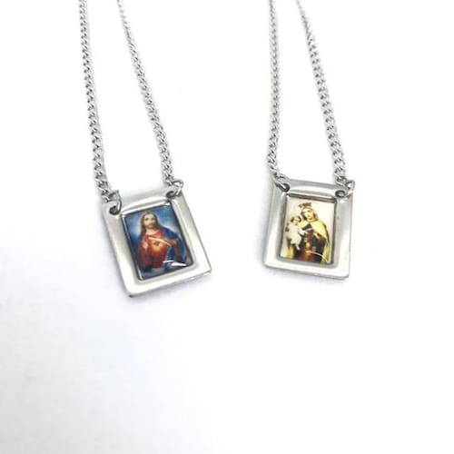 Escapulário N.S. Carmo Aço inóx O escapulário é um objeto símbolo da religião cristã católica, que consiste em duas imagens, uma do Sagrado Coração de Jesus Cristo e outra de Nossa Senhora do carmo, e possui o significado de proteção física e espiritual.