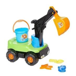 Em plástico resistente colorido (amarelo/verde), com braço e pá móveis em 360° controlados por manivelas, suporta até 30 kg, inclui capacete de segurança e acessórios como baldinho, pá e moldes para brincadeiras completas.