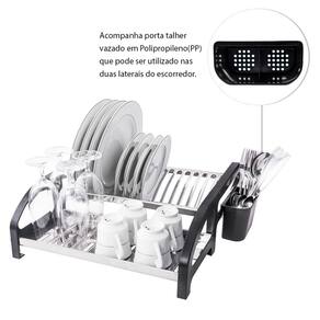 Design moderno. Escorredor de pratos com duas superfícies para acomodação de pratos, louças talheres, panelas e utensílios. Superfície aletada que acomoda verticalmente até 16 pratos de qualquer formato. Bandejas de acomodação encaixadas lateralmente em bases de polipropileno pp na cor preta. Montado com encaixes precisos evitam que o escorredor balance. Acompanha porta talheres em polipropileno pp que pode ser colocado nas duas laterais do escorredor. Disposição das bandejas lateralmente permite acomodar ou empilhar mais louças e utensílios que os escorredores tradicionais. Bonito, prático e de fácil limpeza.