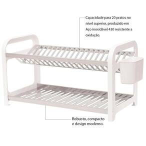 Seu design moderno e formato retangular se destacam, proporcionando um toque de elegância à sua cozinha. Com capacidade para até 20 peças, ele permite que você disponha suas louças para secarem de forma eficiente e organizada.