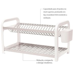 Seu design moderno e formato retangular se destacam, proporcionando um toque de elegância à sua cozinha. Com capacidade para até 20 peças, ele permite que você disponha suas louças para secarem de forma eficiente e organizada.