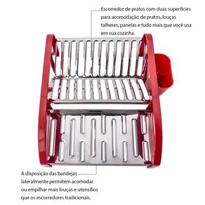 Este escorredor versátil oferece duas amplas superfícies para acomodar seus pratos, louças, talheres, panelas e tudo mais que você utiliza no dia a dia. Suas bandejas são estrategicamente unidas lateralmente em bases de polipropileno pp na cor vermelha, proporcionando não apenas firmeza, mas também um visual moderno e sofisticado.