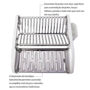 Este escorredor versátil oferece duas amplas superfícies para acomodar seus pratos, louças, talheres, panelas e tudo mais que você utiliza no dia a dia. Suas bandejas são estrategicamente unidas lateralmente em bases de polipropileno pp na cor branca, proporcionando não apenas firmeza, mas também um visual moderno e sofisticado.
