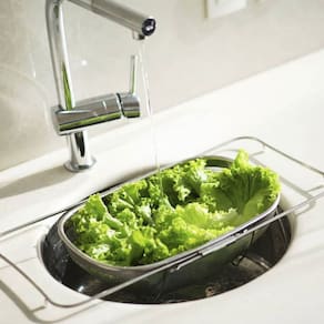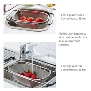 Escorredor com alças retrateis. Escorredor de Alimentos ajustavel é perfeito para lavar legumes, arroz e frutas na pia. O escorredor com alças retrateis é multiuso, produzido em aço inoxidavel dá mais praticidade na cozinha e sofisticaçao a mesa.